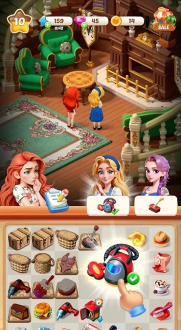 在游戏里,玩家得借助消除类玩法来合成道具。而且,只有把两个一模一样的道具组合起来,才能得到全新的道具。