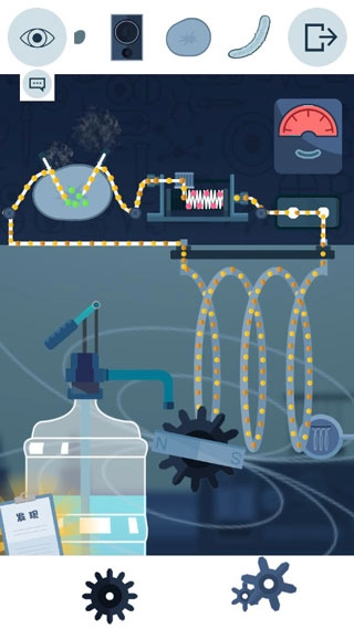 玩家们只需在水管下方放置齿轮,接着在齿轮上安放磁石,随后打开水闸,就能连通电路;之后利用最大电能使灯泡熄灭,即可完成操作。