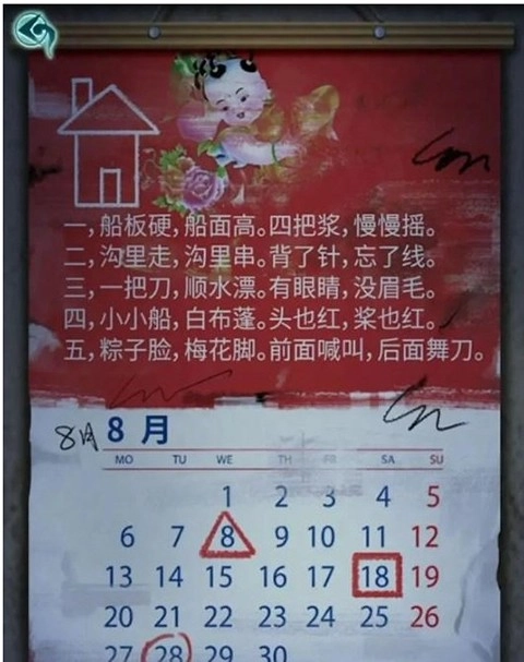走到院子里,把米糕递给那个小女孩后,水缸就能靠近了,看来接下来应该会用到水。正对着的那间屋子也能进去了,进去看了一眼,原来是间库房。先去看看纸人右边的木板,上面提示要“一物换一物”。再看纸人手里的托盘,上面写着不许拿墨块,那我们把木炭放到托盘里,应该就能把墨块拿走了。右边的日历藏着不少线索,最上面的解谜部分我们之后结合其他线索再看,能看到的数字线索是三角形代表8,正方形代表18,圆形代表28,先把这些记下来。
