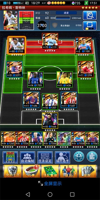 接下来给大家介绍一下球员的适应位置情况:图中的斯特林,其适应位置覆盖了整个前场区域,同时也包括中场的部分位置。需要注意的是,球员只有处于适应位置时,才能充分发挥出自身的全部能力。举个例子,如果把一名5星的前锋球员安排在后卫位置上,他实际所能带来的战力加成,甚至比不上一名4星的后卫球员。由此可见,为球员安排合适的位置是非常关键的。要是大家在初期阶段不太会进行阵容配置,也可以选择使用自动编制功能来完成。