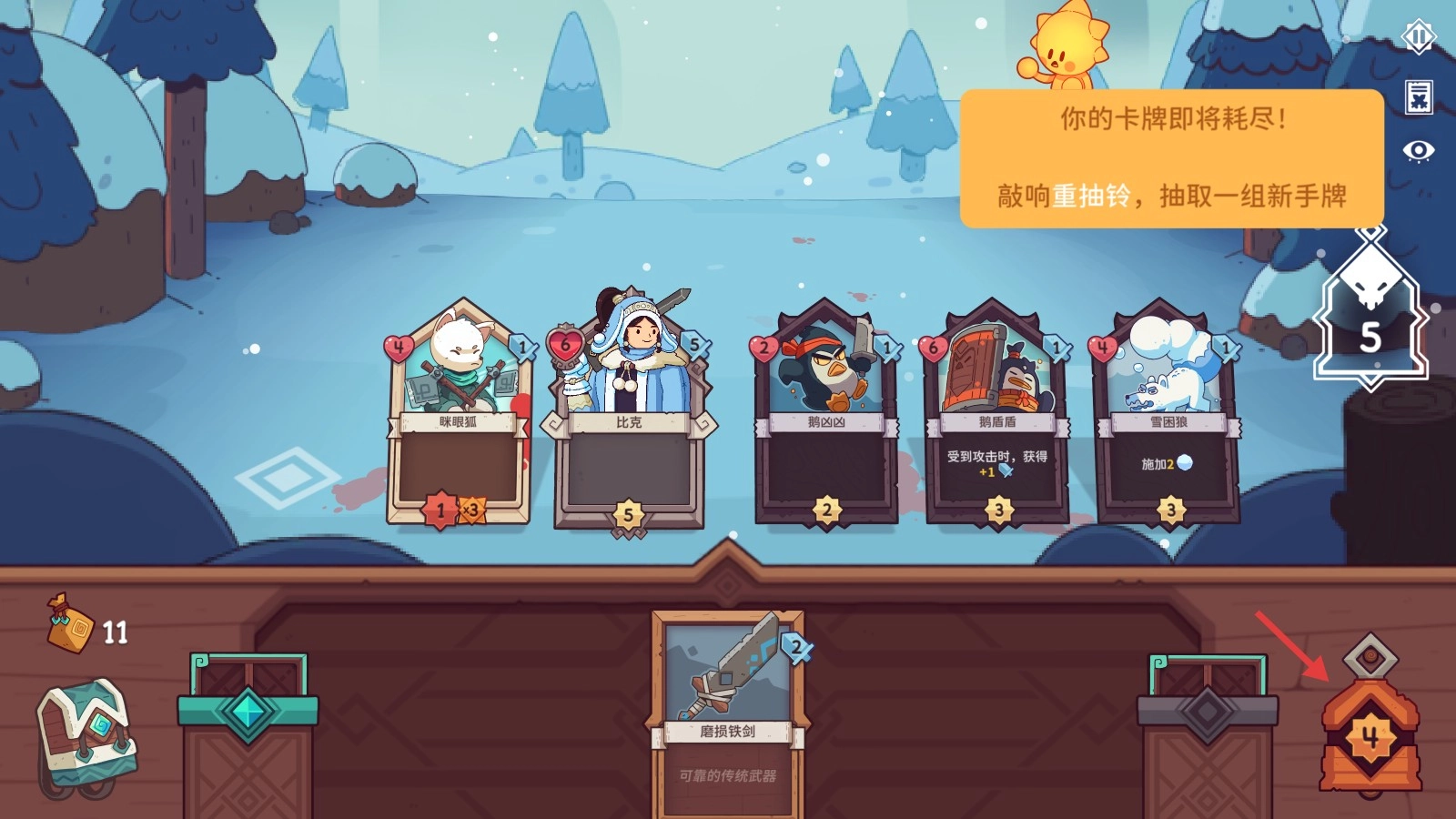 当手牌快要用完时,敲响右边的【重抽铃】,就能抽取新的手牌,继续推进你的战斗策略啦。