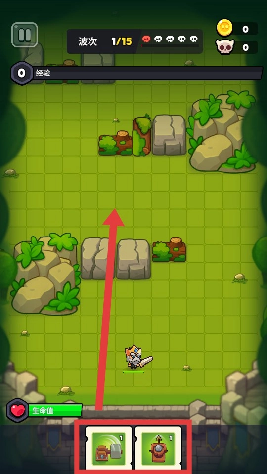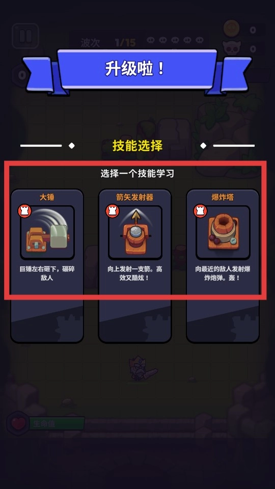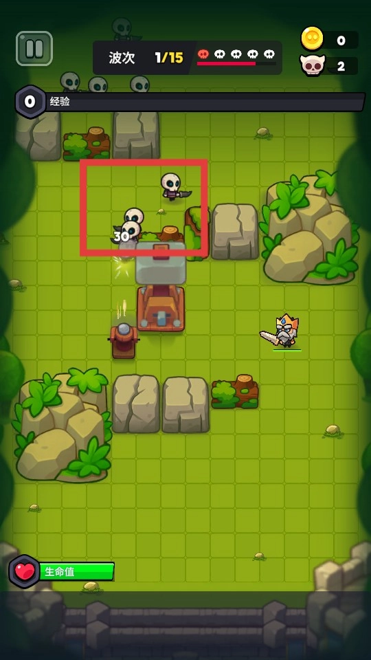 放置好技能后,当遇到红框内的【敌人】时,通过角色与技能对敌人发起攻击,完成【波次】挑战即可获得奖励。