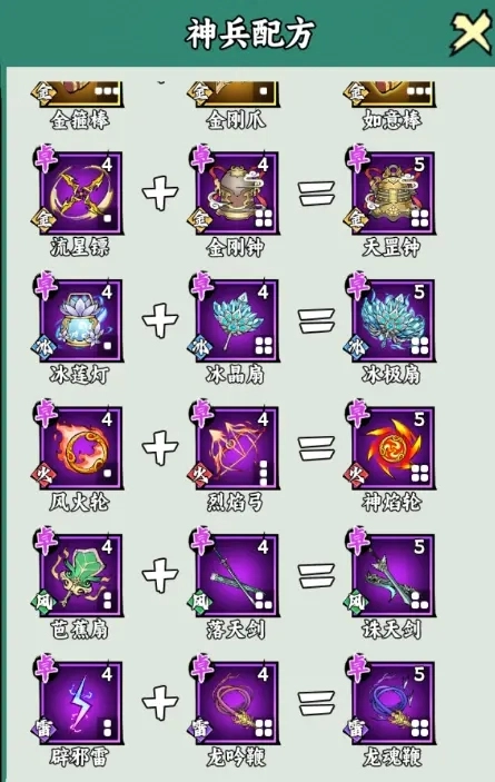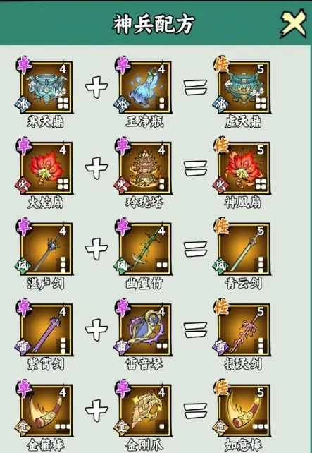 若你对神兵合成毫无头绪,也不清楚所需的法宝有哪些,不妨看看这份详尽的神兵配方图鉴。它会为你提供清晰的指引,你可以根据图鉴里罗列的各类法宝及对应的合成配方,合成出自己梦寐以求的神兵。
