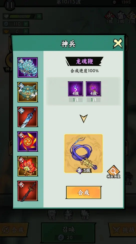在游戏里合成神器,得先把神器配方里的法宝都合成到4级,这时候旁边左上角就会弹出一个神兵合成的UI提示。