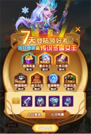 7连续登录7天可领取传说英雄冬雪女王、神话熊猫酒神,还能自选三系输出英雄,更有海量其他福利等你领取。