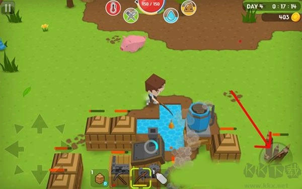 挑选一块靠近池塘的地方,安置营火和工作台。等工作台搭建好后,“攻击”键的上方会显示出工作台的图标,点击该图标就能打开工作台了。