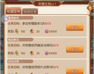 帝盟任务是获取帝盟影响力与帝盟贡献值的主要方式。完成每日物资任务后,陛下还能额外得到道具虎符,而虎符可用来提高帝盟势力的好感度。
