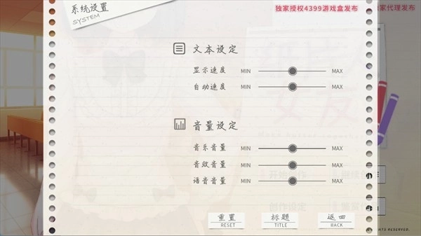 进入游戏先调基础设置,如文本速度、语音音量等,不满意还能一键重置恢复默认。