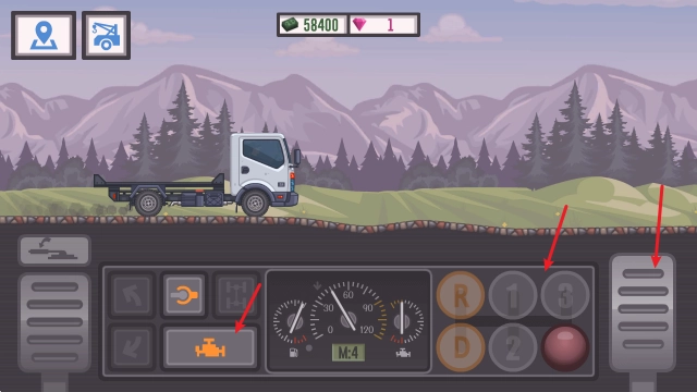 开始驾驶后,先点击左侧的发动机,接着挂挡,然后按住右侧的油门就能前进了。