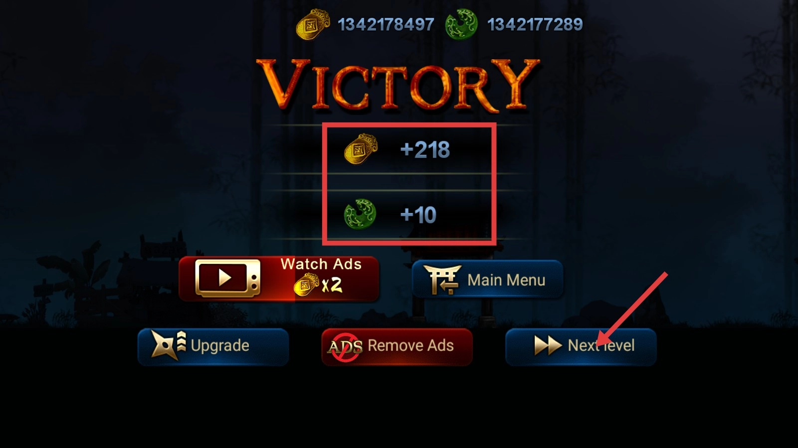 完成关卡即可领取【+218金币】与【+10翡翠】,点击【Nextlevel】按钮,就能解锁后续的关卡内容。