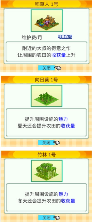 除了道具之外,搭建合适的环境设施同样能增加作物产量。稻草人在提升产量方面效果显著。另外,部分环境设施会依据季节对产量产生加成作用,比如竹林有助于提高冬季的收成,向日葵则能提升夏季的收成等。