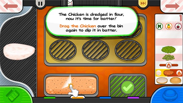 【面包、面糊和油炸】给鸡肉涂上各种面包屑和面湖选项,然后将鸡肉放入油炸锅中烹饪至完美! Papa Louie 需要在竞争中获得优势,所以随着时间的推移,他可能会开始引入除鸡肉以外的其他食物来炸!