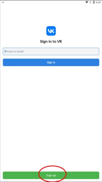打开VK应用,进入登录页面后,点击页面下方的“Sign up”选项