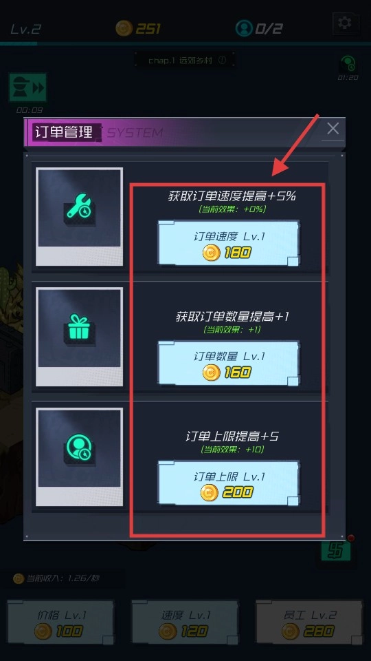 进入“订单管理”界面后,使用金币来提升“订单速度”“订单数量”“订单上限”这几项属性,以此优化与订单相关的各项能力。