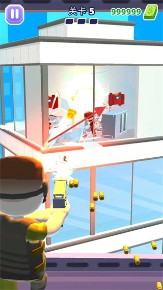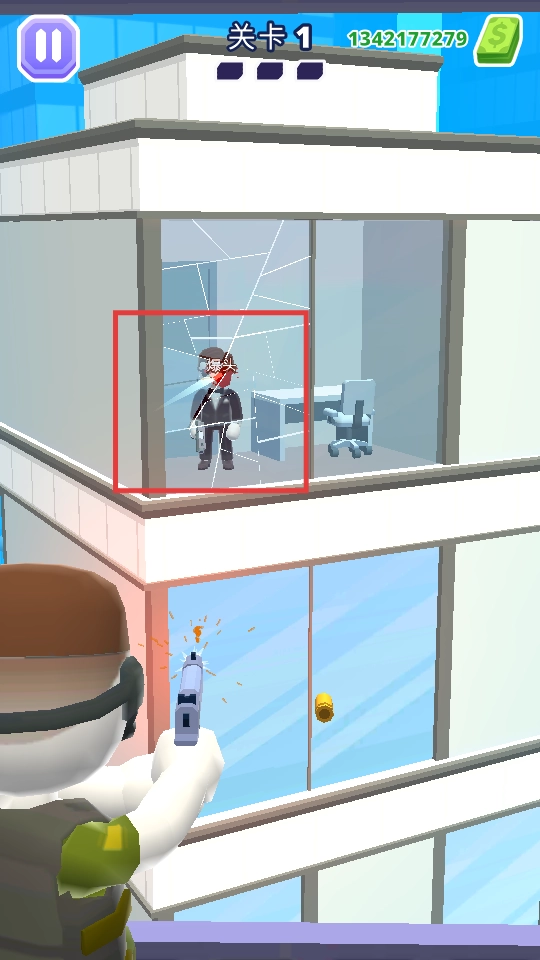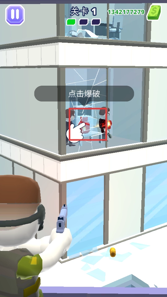 操控武器对准建筑物内的目标群体,发射后击碎玻璃并消灭目标,上方的任务进度条随之逐步增长。