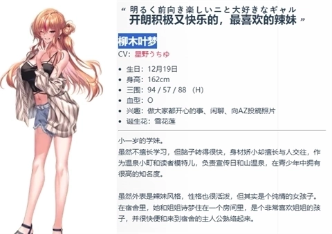 温柔甜美的班级红人,性格和外表很有反差,游戏内有不少地雷系穿搭。