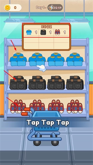查看订单列表,确认需收集的物品是蓝色上衣、黑色包、红色鞋子各一件,然后点击页面上显示的“Tap to continue!”按钮。