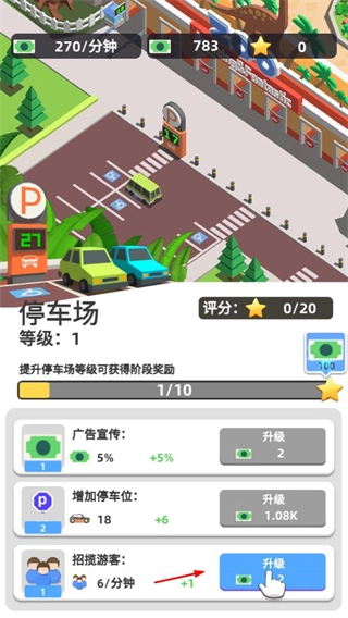 在停车场界面,通过消耗资源来升级相关功能,以此提升游客的到访数量和收益获取效率,进而推动设施等级的逐步成长。