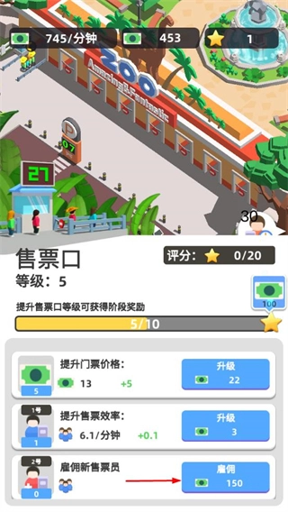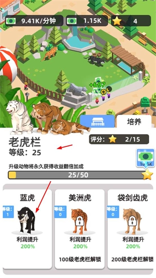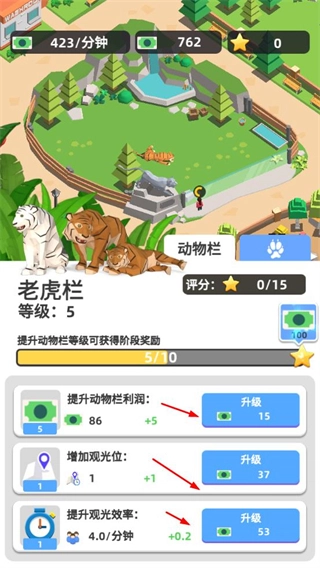 在动物栏界面,可对利润、观光位等属性进行升级,以此增强动物栏的收益能力和游客承载量,从而提升关卡评分。