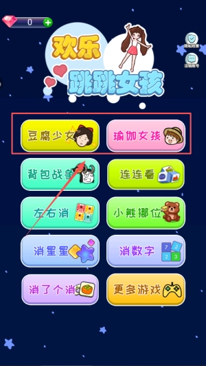 进入应用主界面后,能看到“欢乐跳跳女孩”的标题,还有“豆腐少女”“瑜伽女孩”等多个游戏入口,点击你感兴趣的游戏就能开始体验了。