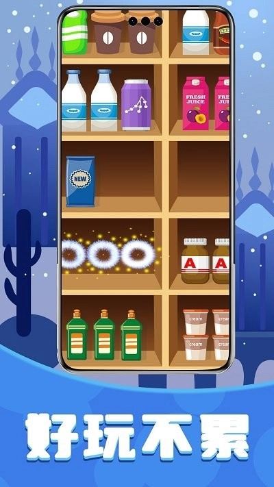 《爱消除货柜》是一款围绕货柜整理与三消匹配打造的休闲解压游戏,玩家需要对货柜里的零食、饮料、水果等各类物品进行分类,只要把三个相同的物品拖到同一货架层就能完成消除。货架上的物品有前后遮挡的情况,只有先消除或移走前排的物品,后排的物品才可以被操作。这样的机制提升了游戏的难度,需要玩家仔细观察物品的摆放顺序,对移动路径做出合理的规划。