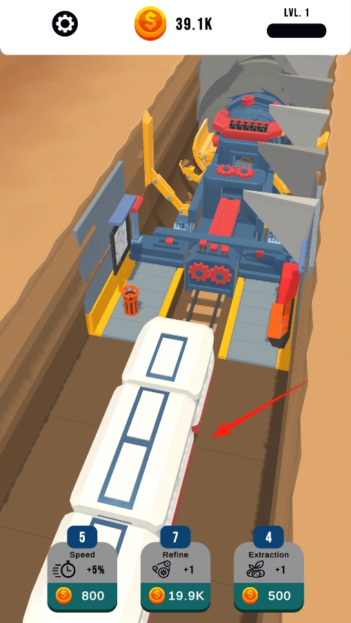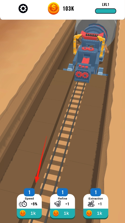 进入隧道挖掘机后,依次点击Speed、Refine、Extraction按钮,通过消耗金币来升级对应的属性,以此提升挖掘速度、精炼水平或开采能力,助力采矿车更高效地进行挖掘作业,同时体验有趣的属性养成机制。
