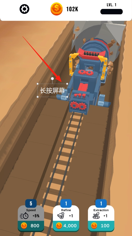 长按屏幕即可操控采矿车进行挖掘作业,持续按压时采矿车会向前掘进并收集资源,松开手指则停止工作。你可以通过长按操作来把控挖掘节奏,尽情体验这种交互式的挖掘玩法。