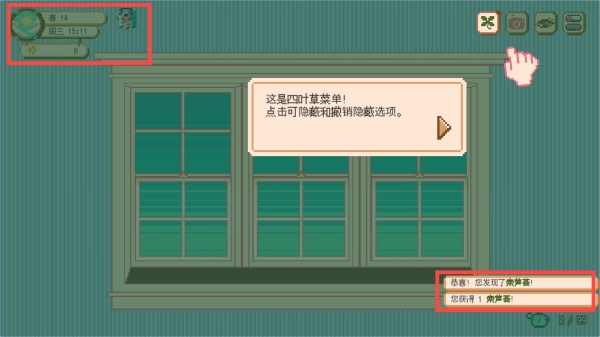 请留意左上角的日期和资源信息,点击【这是四叶草菜单!点击可隐藏和撤销隐藏选项】来进行界面操作,以便获得更顺畅的游戏体验。