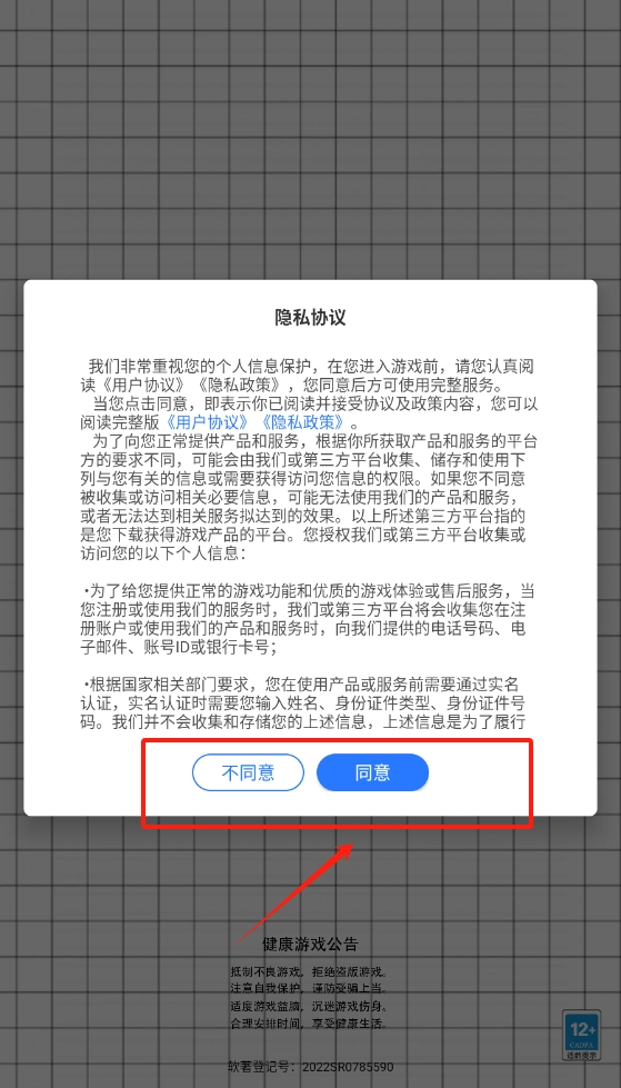 若您同意相关条款即可进入游戏,不同意则请退出;同时请注意查看隐私协议与适龄提示内容。