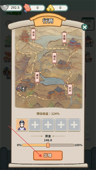 若想成为商户,需先前往行商处,安排好商队人员后,在下方设定出资数额,随后点击出发即可进入剧情。