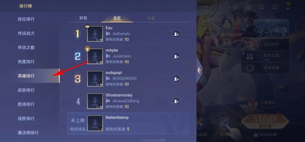 在这里可以查看段位排行、传说战力、传说之巅、热度排行、英雄排行等内容。点击进入英雄排行页面,就能看到自己的英雄战力在好友圈以及全区范围内的排名情况。