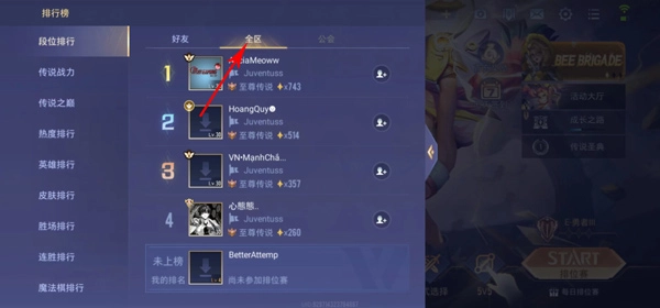 进入段位排行界面后,点击“全区”选项,就能查看自己在全区范围内的排名情况了。