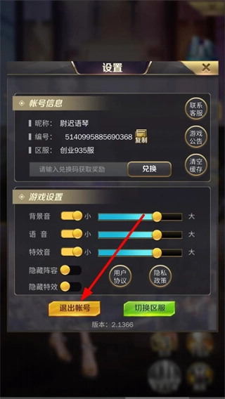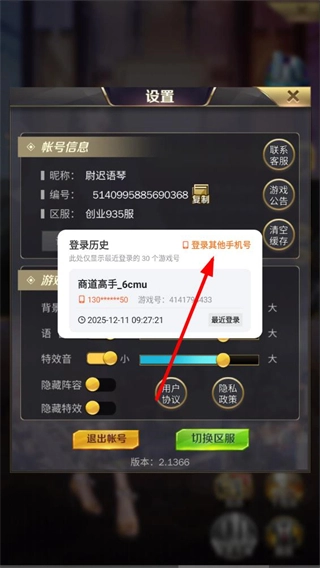 在设置界面的游戏设置板块下方,找到退出账号按钮并点击,此时会弹出登录历史窗口。