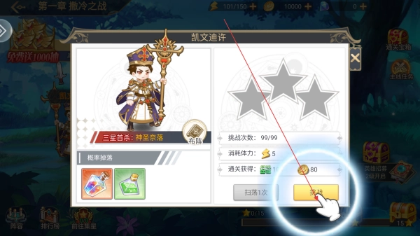 点击关卡里的敌人角色,像凯文迪许这类,查看挑战详情,确认好体力消耗以及通关能拿到的奖励后,点击挑战按钮就能开启战斗了。