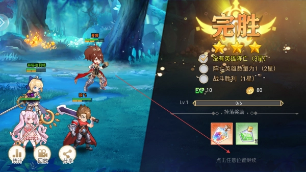战斗结束后,先查看战斗评价与掉落奖励,点击任意位置即可继续游戏,随后使用获取的资源培养英雄,进而挑战后续关卡。