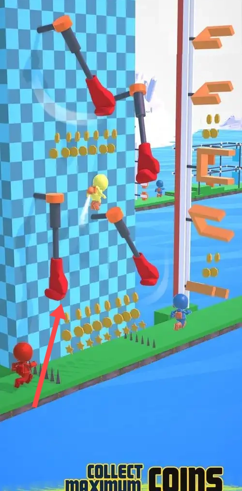 在赛道上小心躲避如红色拳击手套等障碍物。