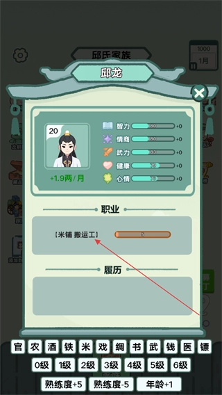 在角色个人信息页面,能够看到当前职业是米铺搬运工,之后可以通过提升职业熟练度来解锁更高级别,推动角色的成长历程。