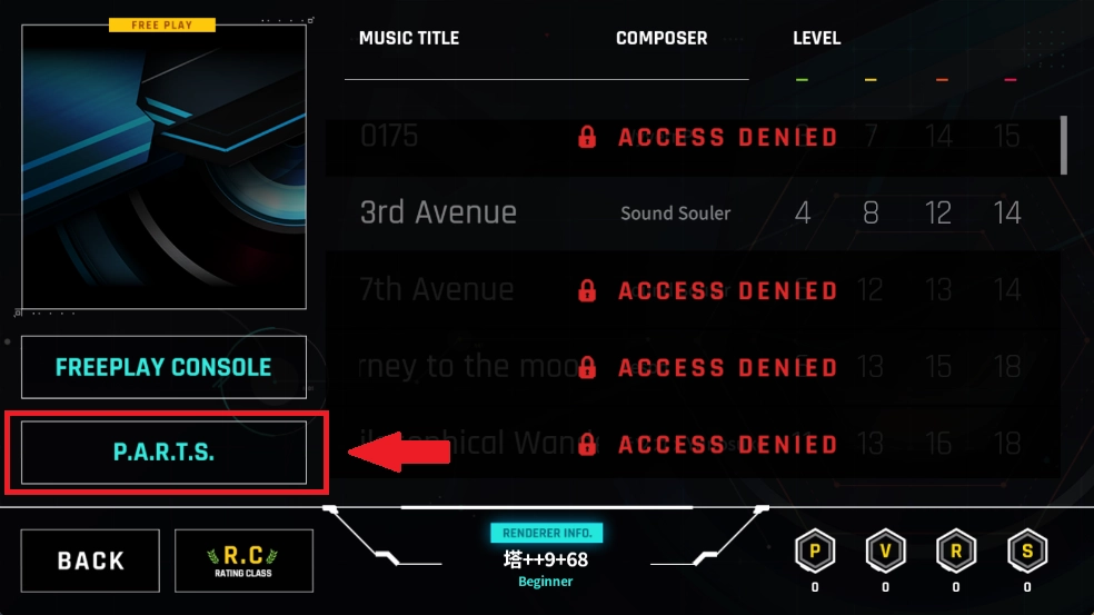 点击左下角的P.A.R.T.S按钮,就能更换打歌界面里的按键、滑轨以及点击特效这类外观元素。