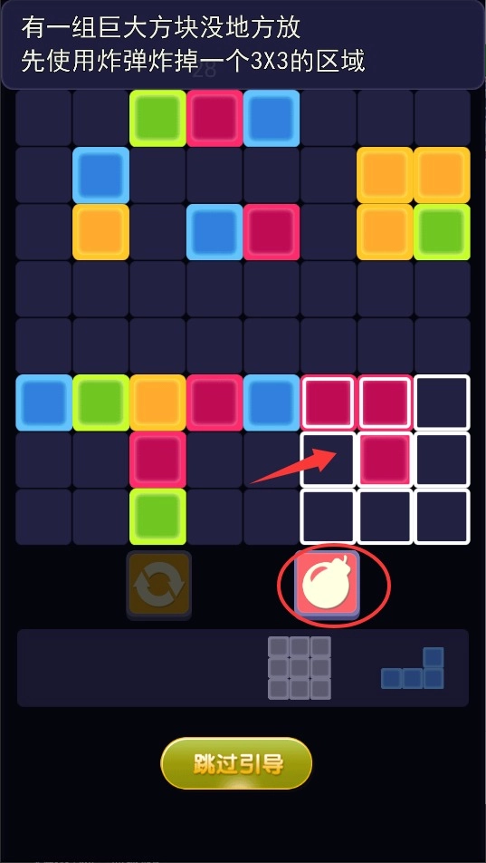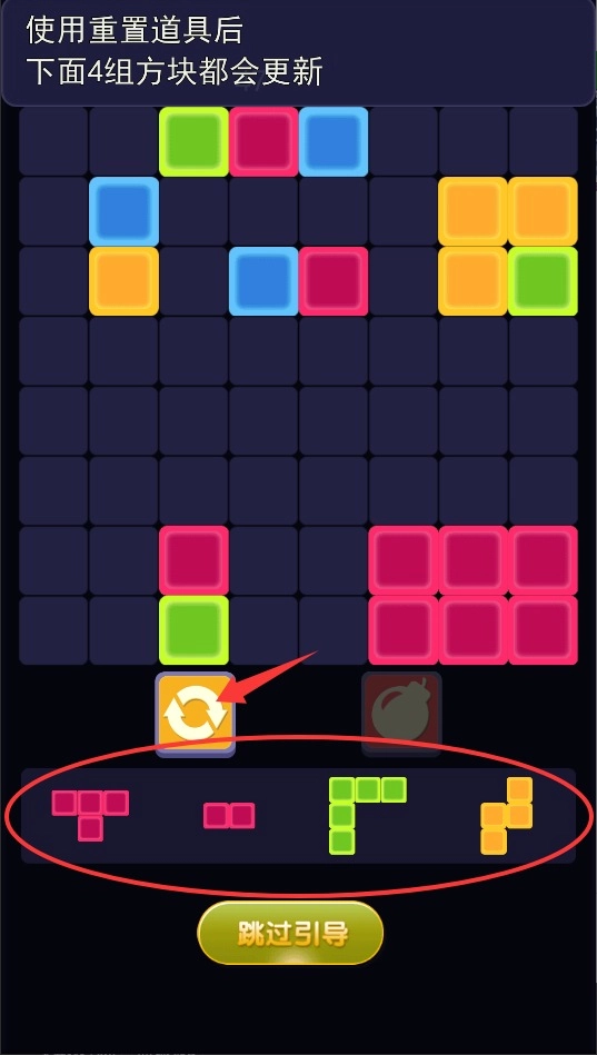 当局势陷入停滞时,点击刷新按钮可以重置下方的待选方块,以此获取新的组合可能,从而继续推进消除挑战。