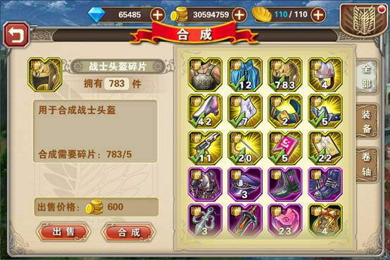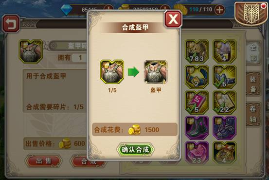 第一, 点击主城右侧“合成”按钮,看到有绿色勾号标记的即表示该碎片可以合成相应装备,点击右侧合成按钮,即可进入合成界面。最后点击“确认合成”即可合成一件相应的完整的装备。