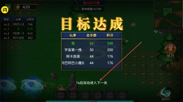 当前关卡目标已达成,请查看界面上显示的击杀数和积分数据,等待片刻后将自动进入下一关继续游戏。