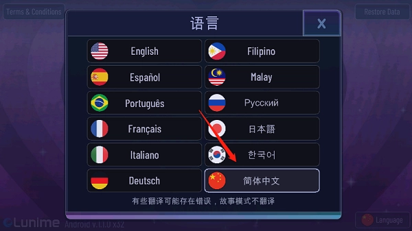 安装游戏后启动程序,待进入主界面(界面显示如图),点击右下角的“language”按钮即可。