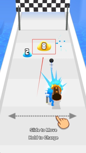 游戏开始后,你可以滑动屏幕来操控角色在黑白格组成的赛道上移动,要留意收集标有“8”和“2”的分数道具,当靠近炮筒时,按住屏幕进行蓄力,为发射做准备。