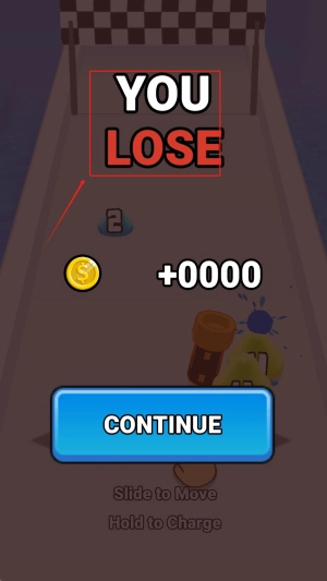 挑战失败时会出现“YOU LOSE”界面,可在此查看获得的金币奖励数额,点击“CONTINUE”按钮即可消耗金币立即复活并继续游戏。