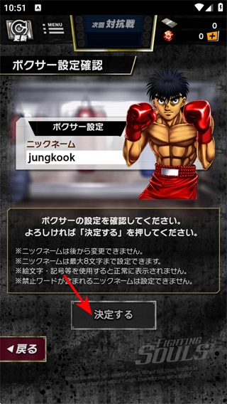在拳击手设定确认界面,确认昵称等信息准确无误后,点击确定按钮,即可完成拳击手的创建流程,正式进入游戏世界。