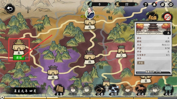 在地图界面点击【秦】对应的【前往】按钮进入城池后,就能查看该势力的【关系-陌生(1)】等信息,进而推进势力相关玩法。