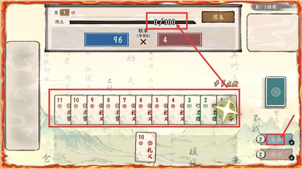 凑出连续数字的牌型能够获得【+11点数】,推动【得点-0/300】的进度,并且会触发【联章】牌型的效果,帮助达成关卡目标。
