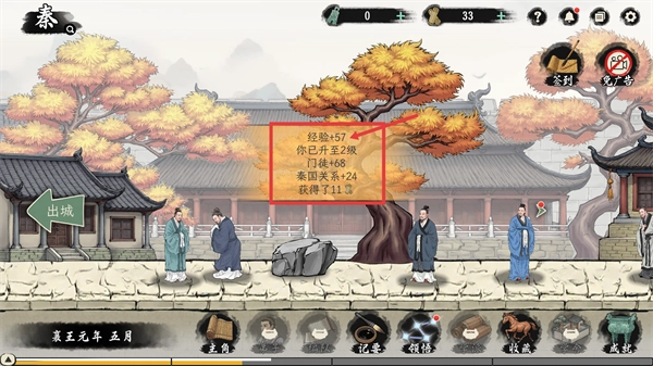 完成该玩法后,你将得到【57点经验值】并升级至2级,同时还会增加【68个门徒】和【24点秦国关系值】,通过积累这些资源可以解锁更多游戏内容。