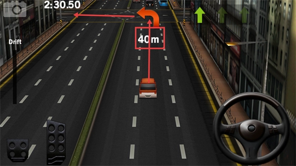 驾驶时切换至【D档】前进,留意到【70米右转标识】时,提前放慢车速调整行驶方向,结合【漂移】操作平稳通过弯道。