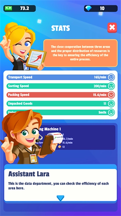 玩家能够设立分拣部、运输部等不同部门,推动各部门高效运转,持续完成货物运输工作;对部门进行合理规划与安排,能够有效提升公司整体的运营效率。